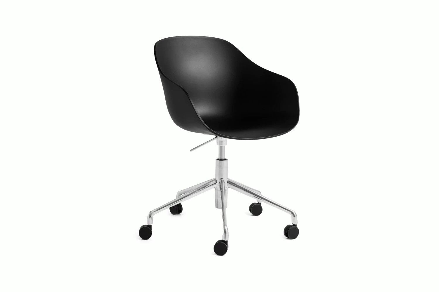 - Cast-aluminum swivel base with casters and a height-adjustable gas-lift mechanism.